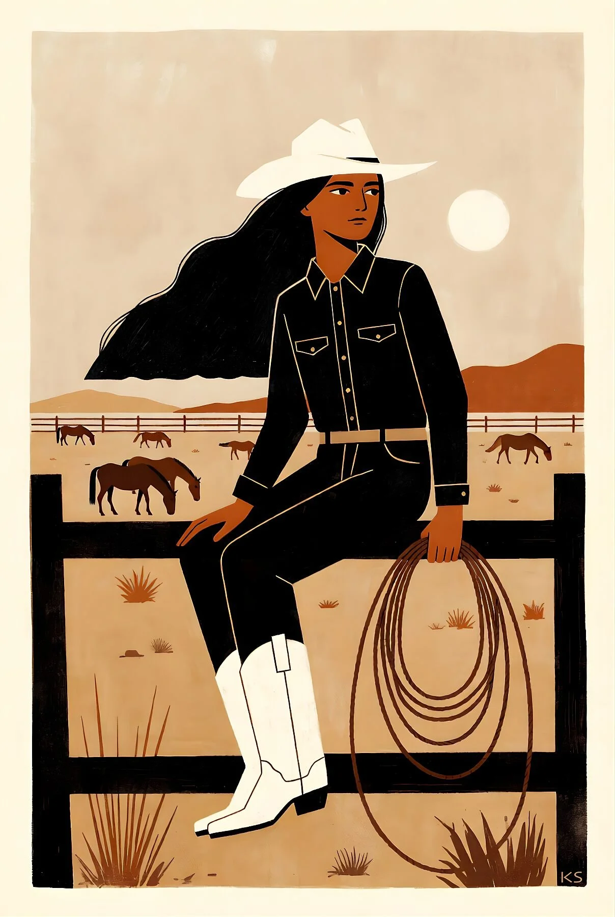 A minimalist Western folk illustration of a dark-haired rider dressed in black, seated calmly on a ranch fence with a coiled lasso resting in her hand. Behind her, horses wander through the quiet desert pasture beneath a pale sun.