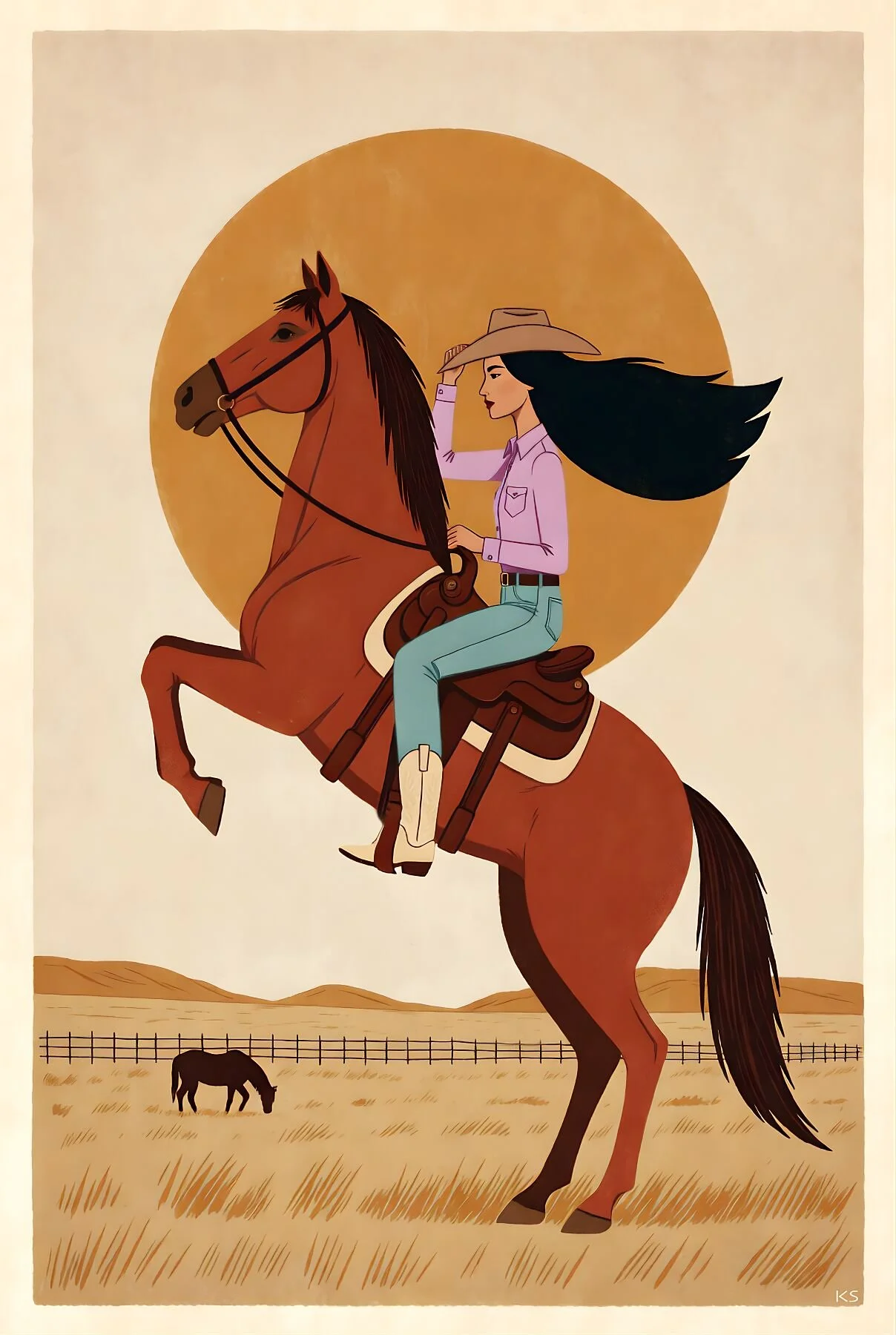 A minimalist Western folk illustration of a dark-haired cowgirl riding a rearing chestnut horse across a wide ranch pasture. Her long hair flows behind her as the horse rises beneath a warm desert sun, while distant grazing horses and low desert hills stretch across the horizon.